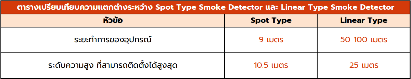 จากตารางเราจะพบว่าระยะทำการของ Linear Type จะมีระยะทำการที่กว้างกว่ามาก แต่แลกมาด้วยราคาของอุปกรณ์ที่สูงขึ้น โดยหากเป็นพื้นที่ขนาดใหญ่ ค่าใช้จ่ายในการติดตั้งระบบสัญญาณแจ้งเหตุเพลิงไหม้ โดยใช้ Linear Type อาจจะมีต้นทุนที่ถูกกว่า Spot Type เนื่องจากระยะทำการที่กว้าง ทำให้ใช้จำนวนอุปกรณ์น้อยกว่าแบบ Spot Type และปริมาณสายสัญญาณที่ใช้ในการติดตั้งมีจำนวนน้อยกว่าผิดกับพื้นที่ขนาดเล็กที่ Spot Type เพียงไม่กี่ตัวก็สามารถครอบคลุมพื้นที่ได้ทั้งหมด แต่ทั้งนี้ทั้งนั้นการติดตั้งจริงจะต้องดูขนาดพื้นที่ ชนิดของสภาพแวดล้อมหน้างานก่อนว่าอุปกรณ์ชนิดไหนมีความเหมาะสมมากกว่ากัน